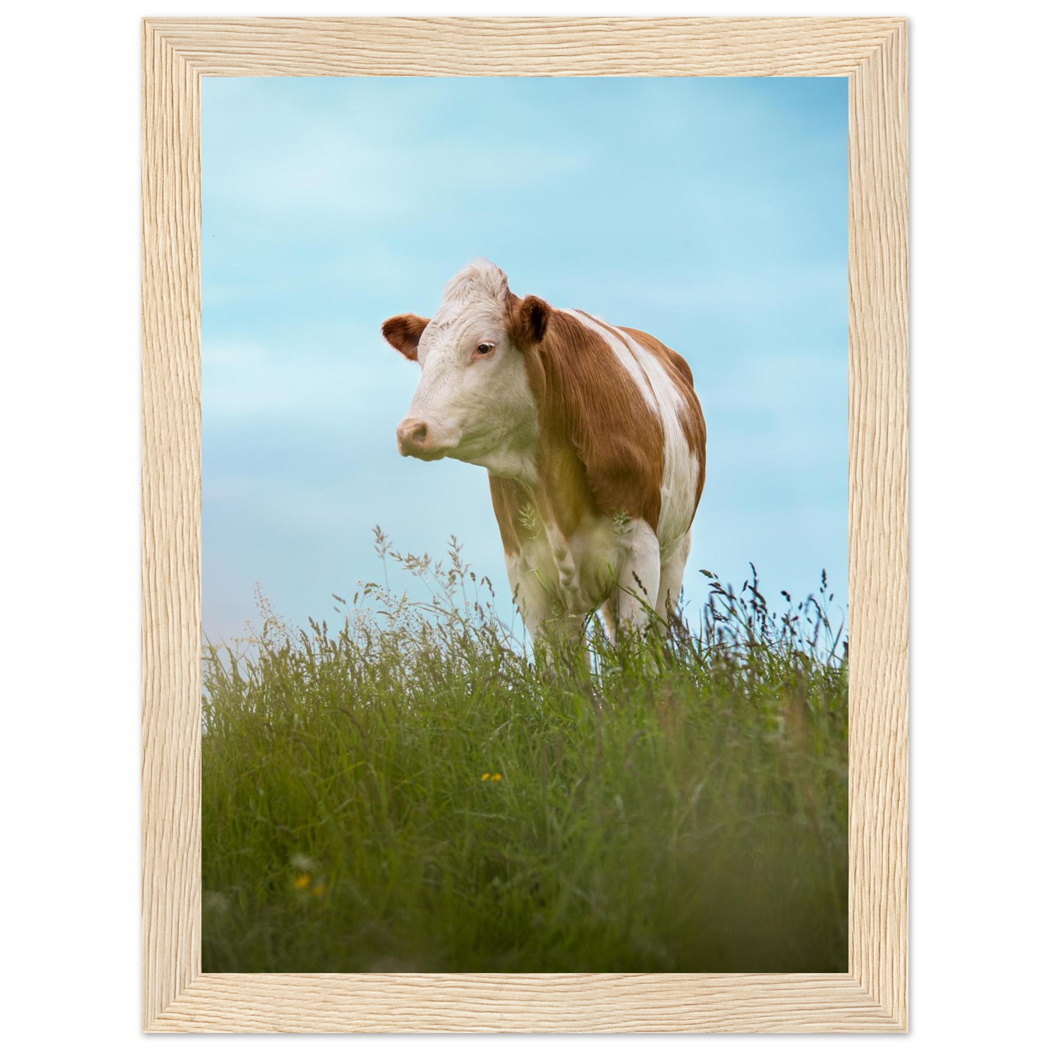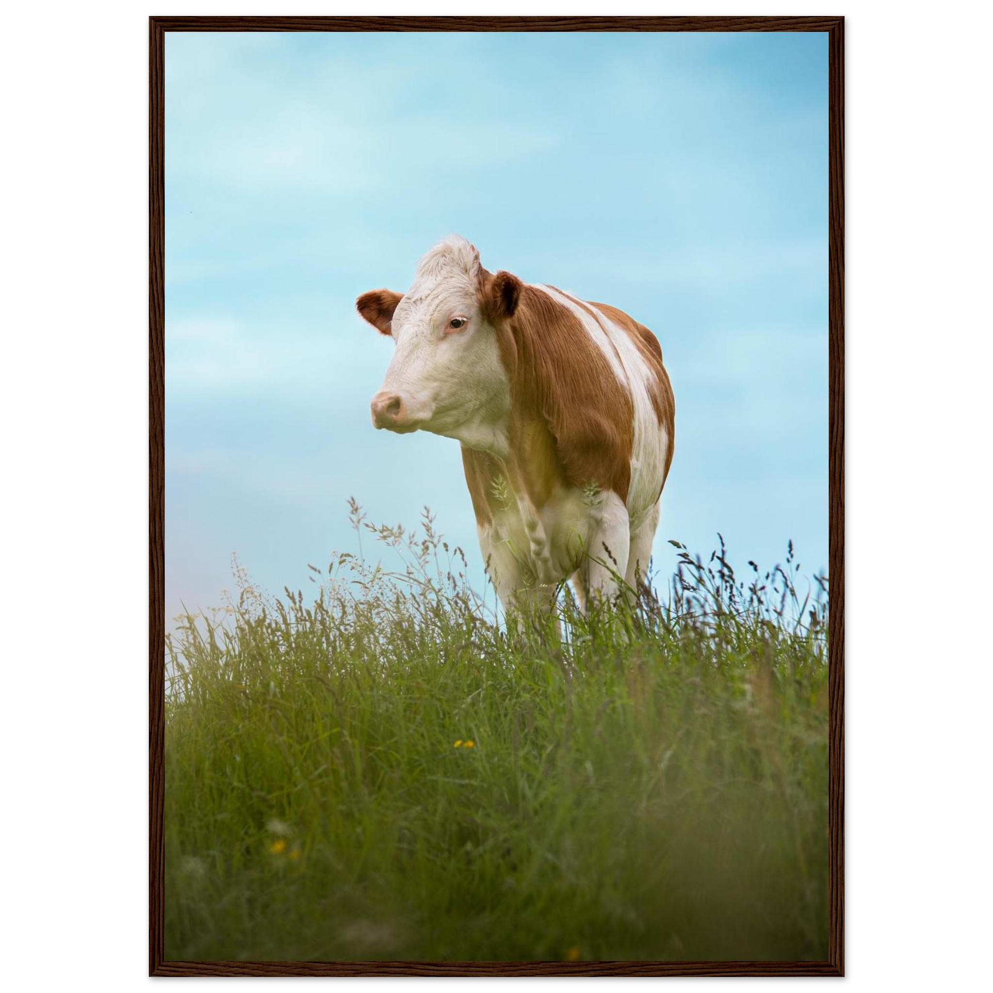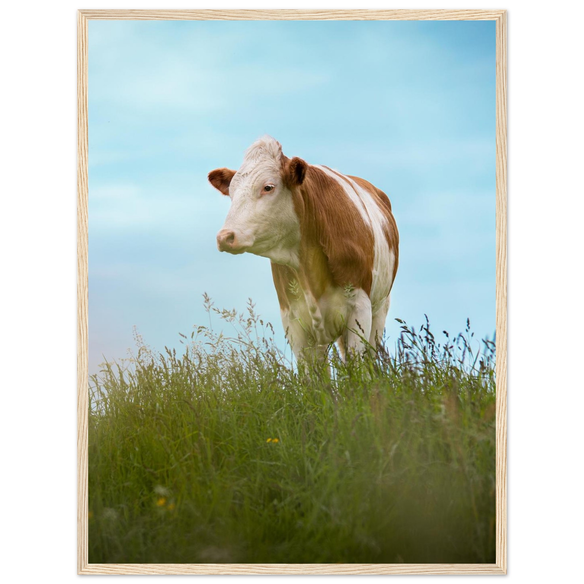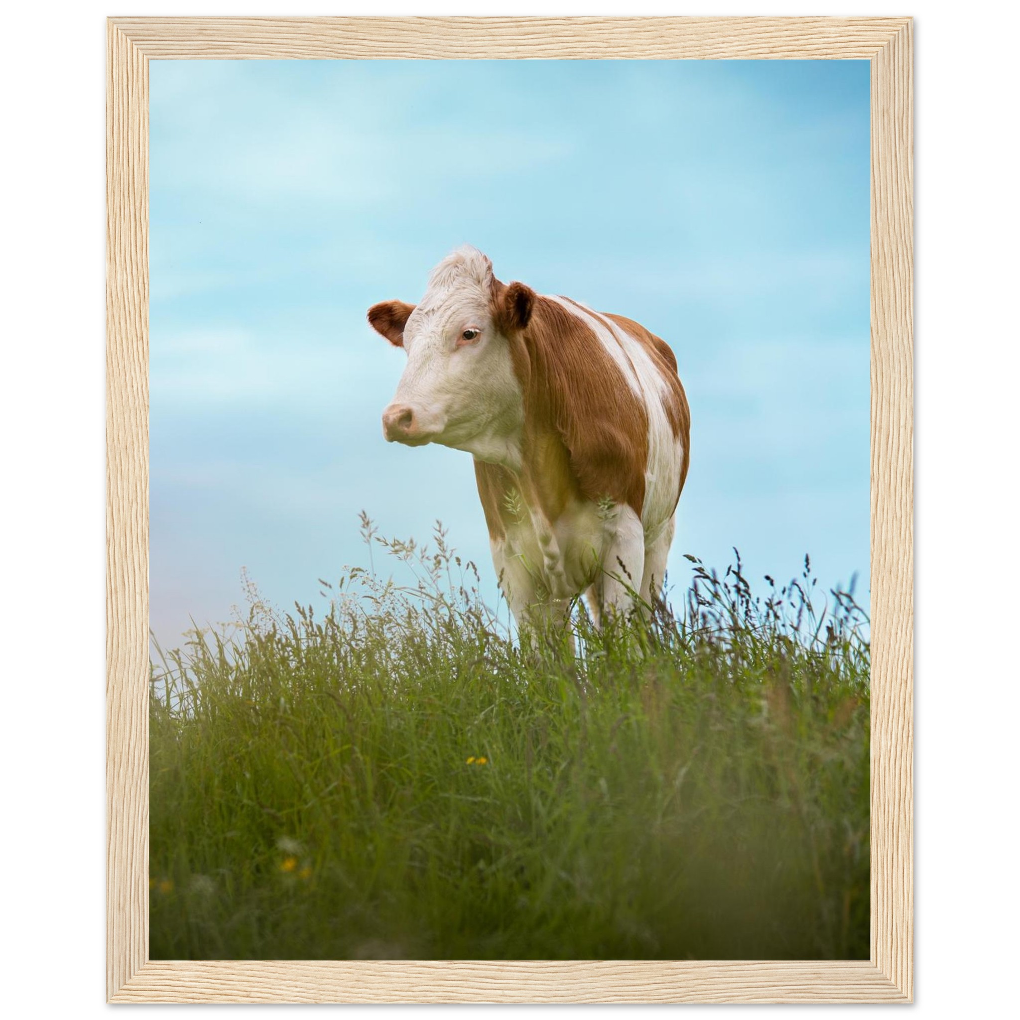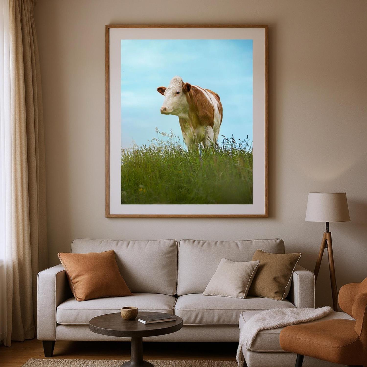 Dieses hochwertige Poster mit einer braun gefleckten Kuh im grünen Gras vor blauem Himmel bringt bayerisches Landhaus-Flair in dein Zuhause. Perfekt als Deko für Wohnzimmer, Landhotels oder als Geschenk für Kuhliebhaber und Landwirte. Geliefert im Echtholzrahmen, auf FSC-zertifiziertem Premium-Papier, in verschiedenen Größen – nachhaltig produziert und sofort aufhängefertig. Ein rustikaler Hingucker für alle, die Natur und Tierfotografie lieben.