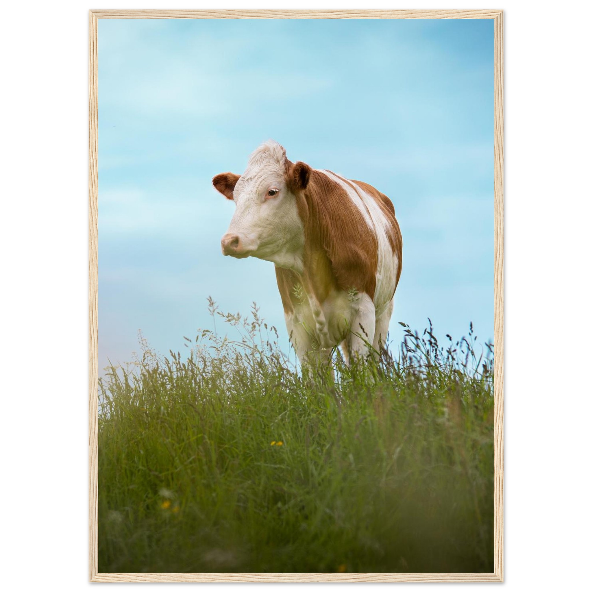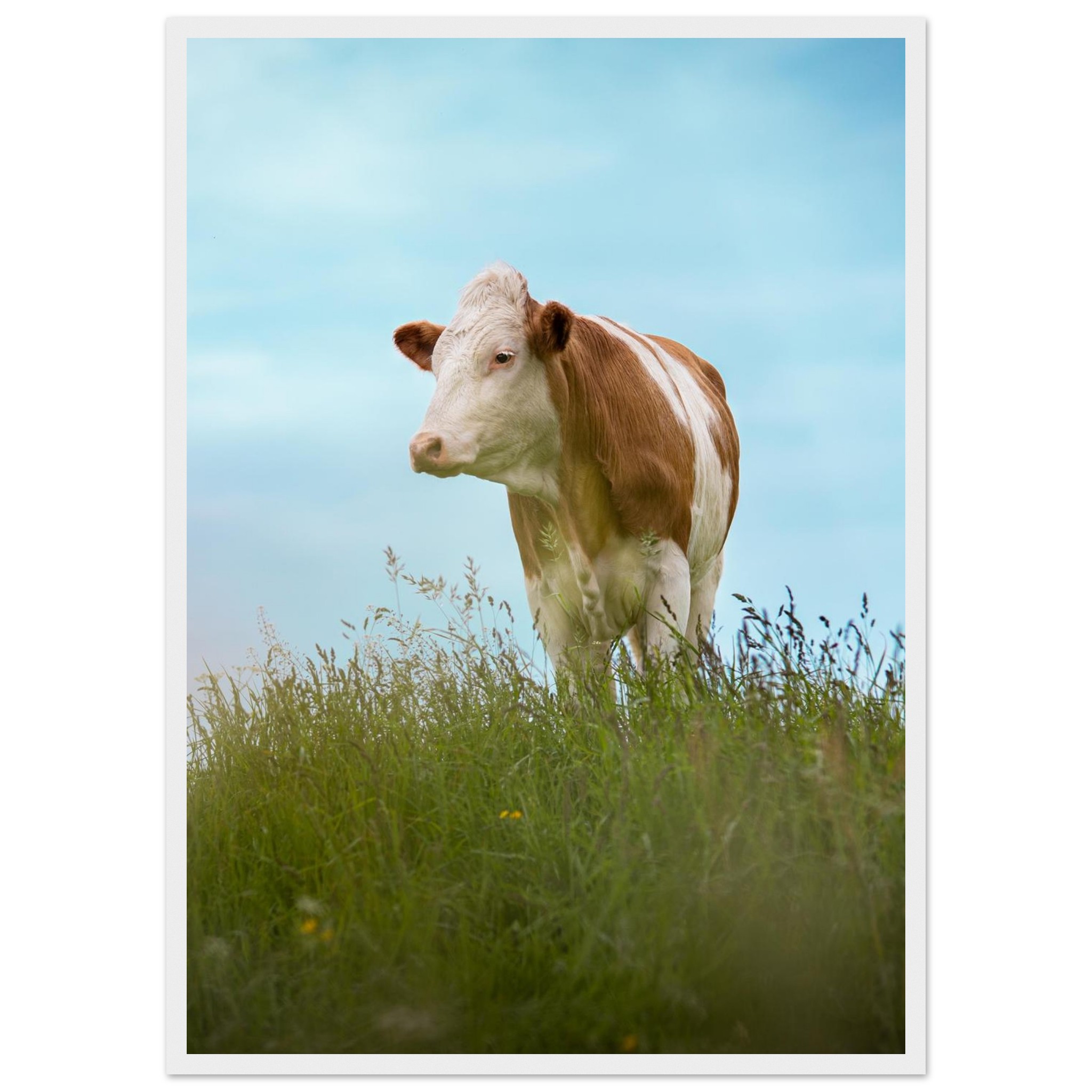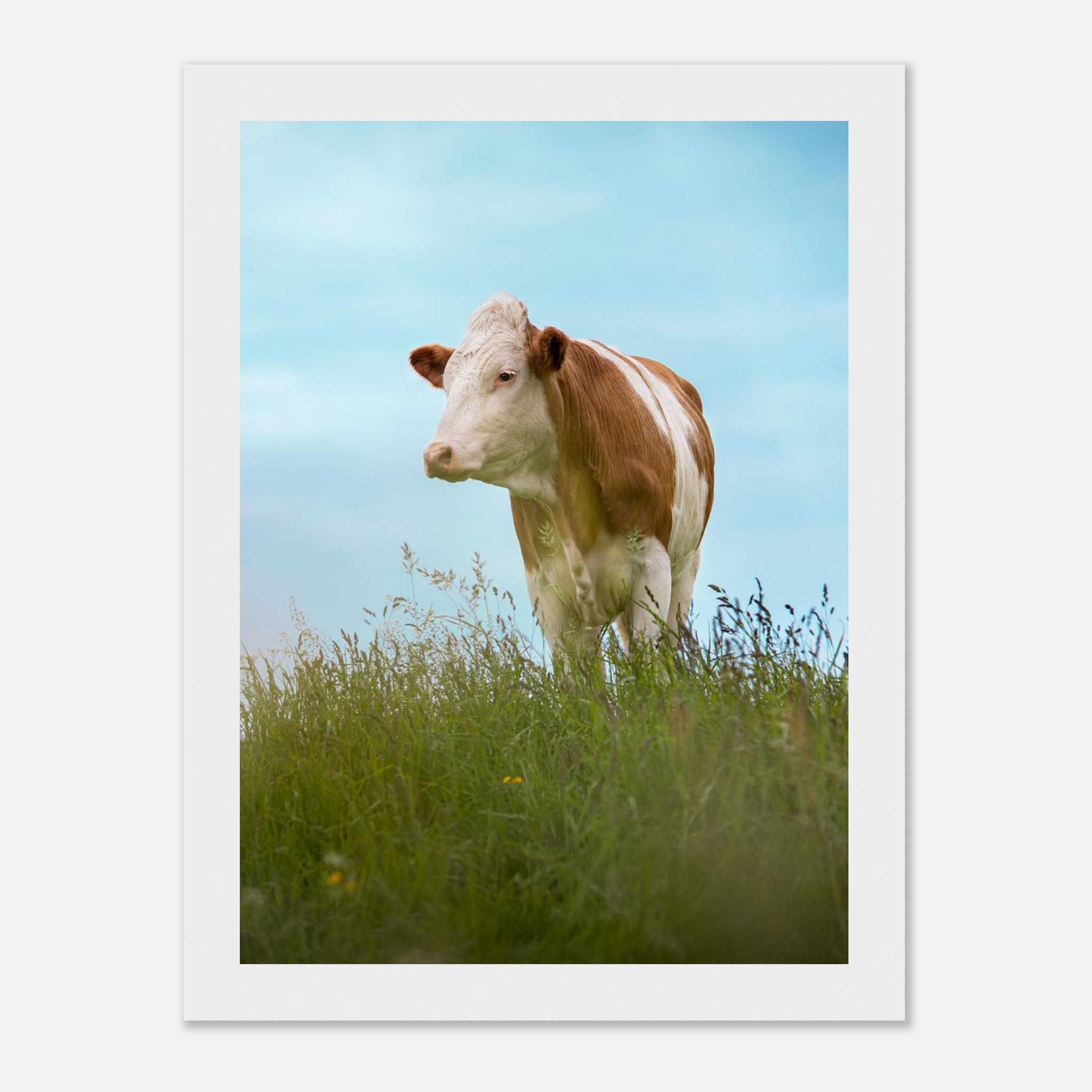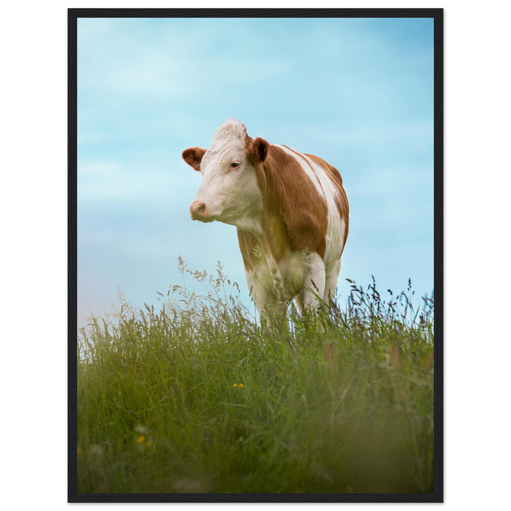 Dieses hochwertige Poster mit einer braun gefleckten Kuh im grünen Gras vor blauem Himmel bringt bayerisches Landhaus-Flair in dein Zuhause. Perfekt als Deko für Wohnzimmer, Landhotels oder als Geschenk für Kuhliebhaber und Landwirte. Geliefert im Echtholzrahmen, auf FSC-zertifiziertem Premium-Papier, in verschiedenen Größen – nachhaltig produziert und sofort aufhängefertig. Ein rustikaler Hingucker für alle, die Natur und Tierfotografie lieben.