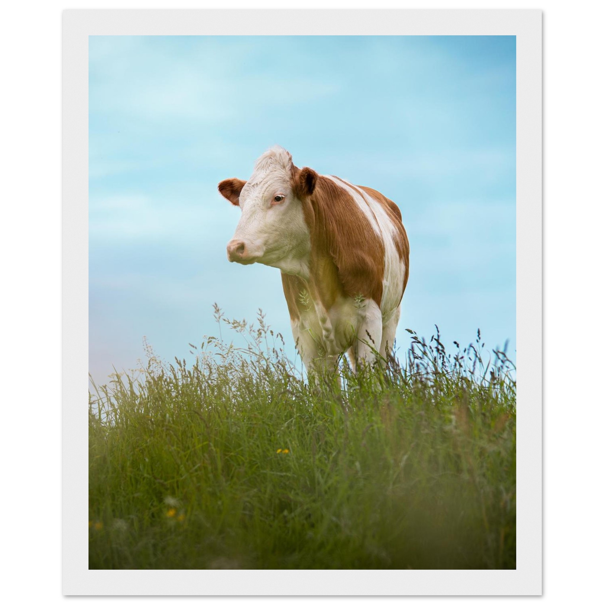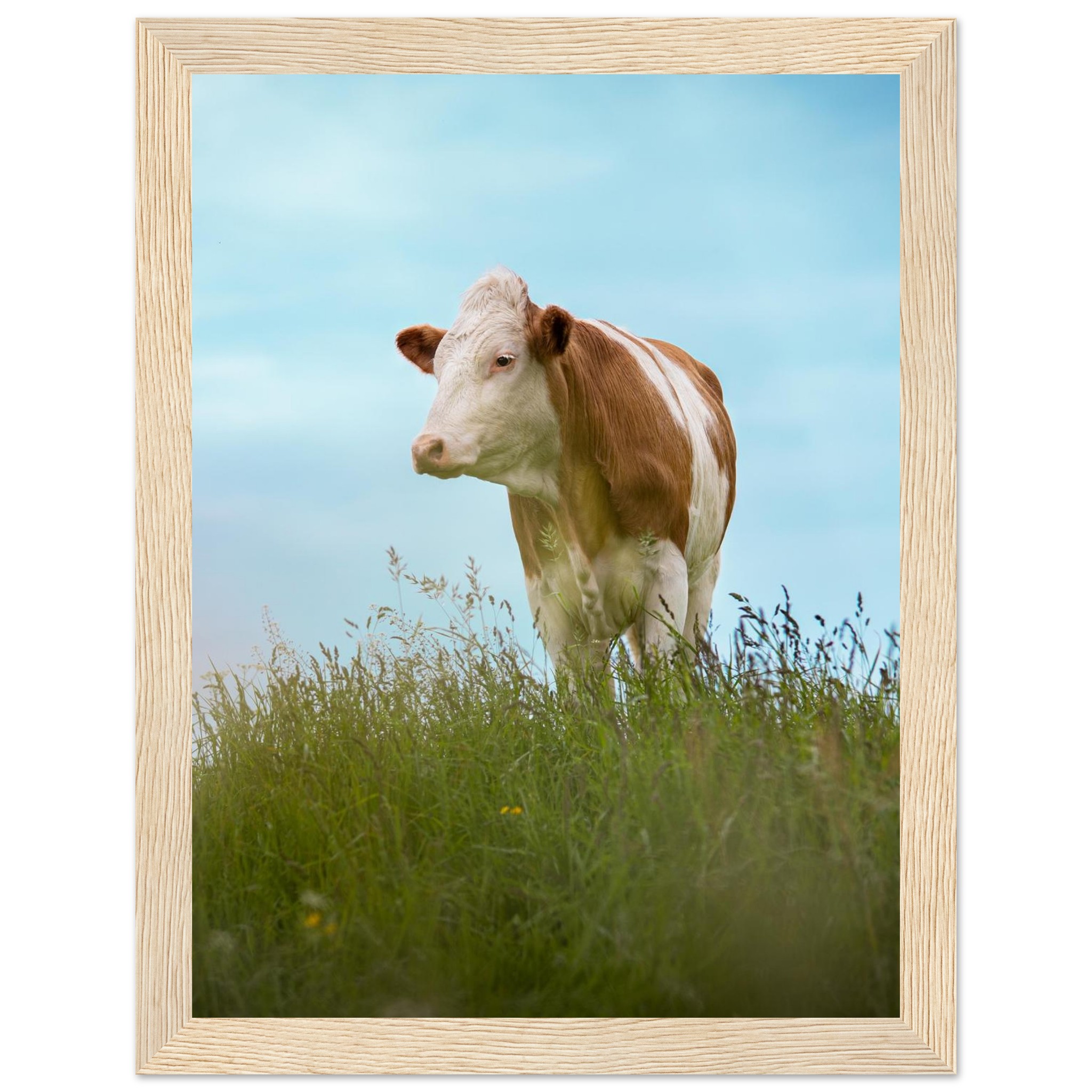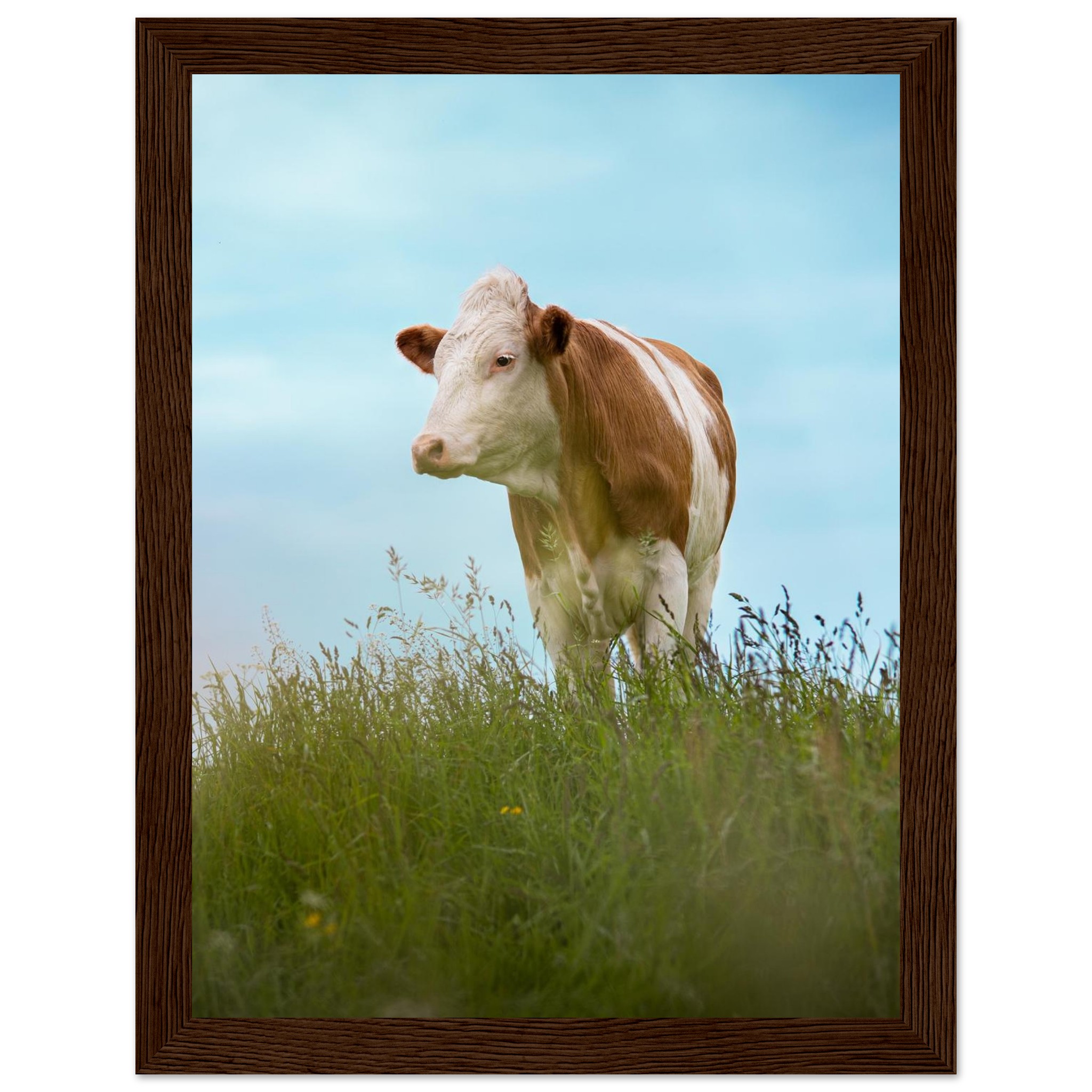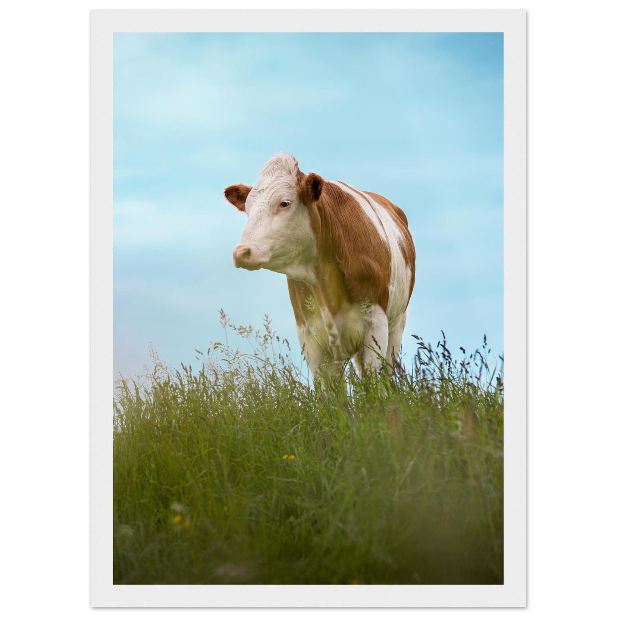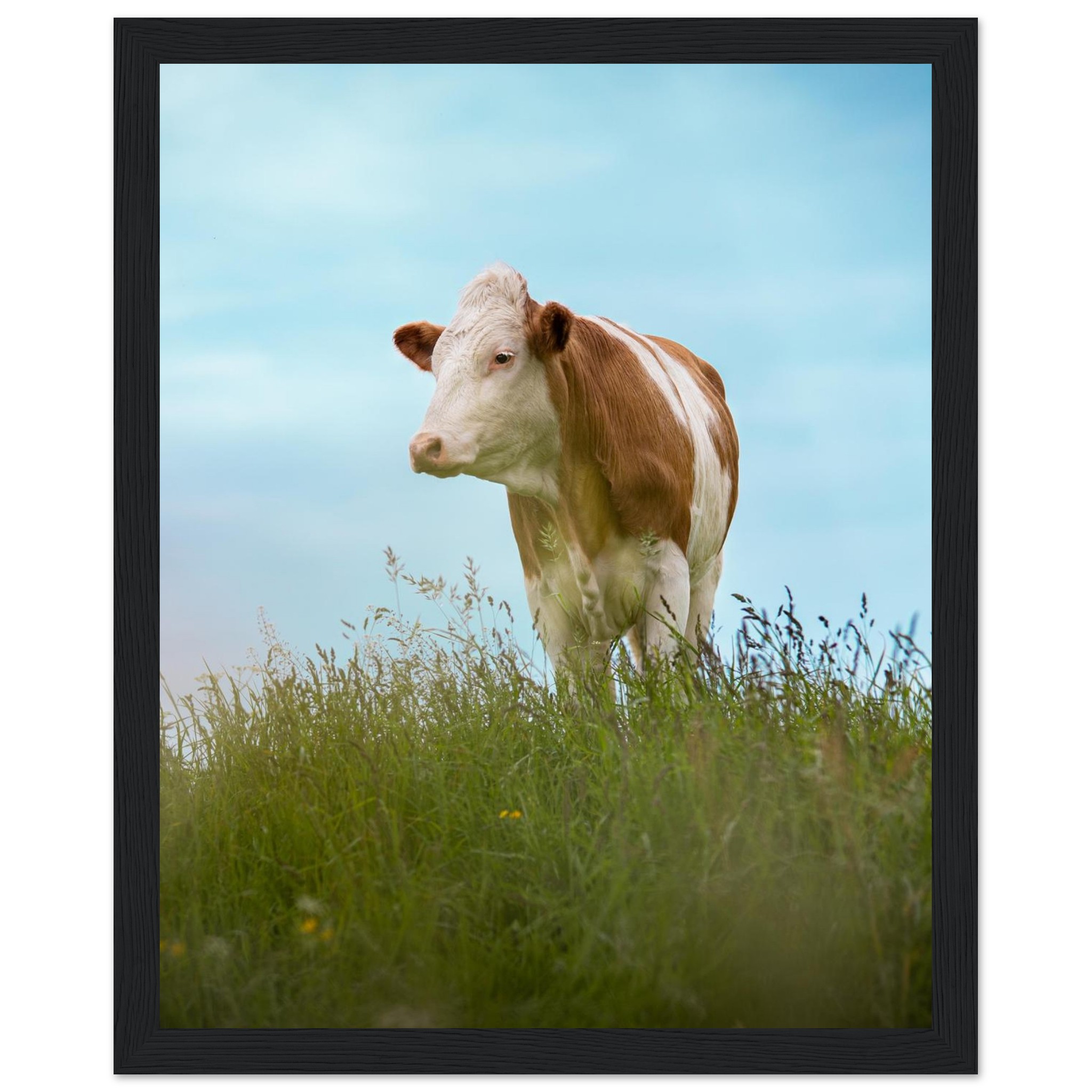 Dieses hochwertige Poster mit einer braun gefleckten Kuh im grünen Gras vor blauem Himmel bringt bayerisches Landhaus-Flair in dein Zuhause. Perfekt als Deko für Wohnzimmer, Landhotels oder als Geschenk für Kuhliebhaber und Landwirte. Geliefert im Echtholzrahmen, auf FSC-zertifiziertem Premium-Papier, in verschiedenen Größen – nachhaltig produziert und sofort aufhängefertig. Ein rustikaler Hingucker für alle, die Natur und Tierfotografie lieben.